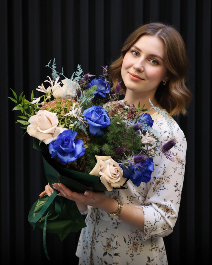 Birthday Flower Bouquet – Luxury Blue & Purple Bouquet is a stunning symphony of cool-toned blooms, where serene blues meet regal purples and pristine whites. Handcrafted by Evlai Flowers, this bouquet combines the soft sophistication of Blue and White Roses with the sculptural artistry of Spider Lilies and the unique texture of Eryngium Purple.