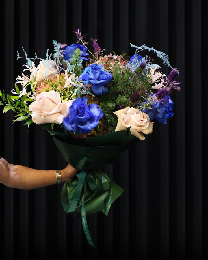 Light Blue Asparagus and Hydrangea add airy volume and depth, while Italian Ruscus and classic Asparagus foliage bring fresh movement and natural elegance. Each stem is thoughtfully arranged to create a harmonious blend of color, texture, and timeless beauty — perfect for gifting or as a centerpiece for unforgettable occasions.