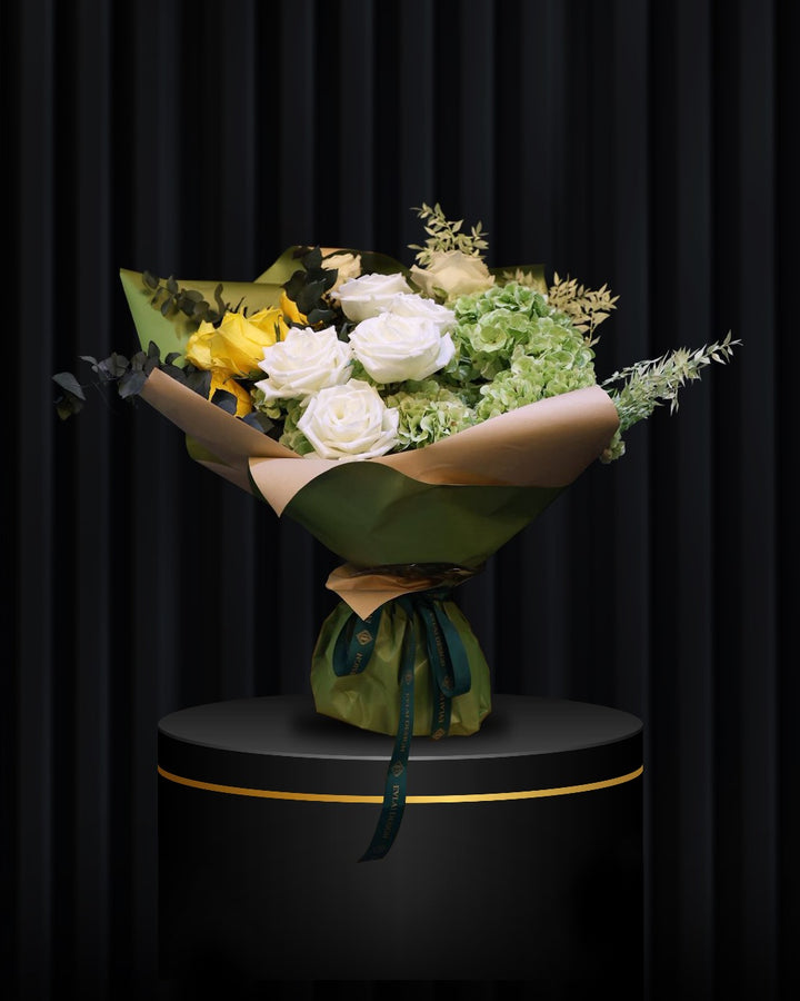 This birthday bouquet pairs the crisp freshness of Green Hydrangea with the soft allure of White and Yellow Roses, creating a vibrant yet sophisticated composition. Italian Ruscus dried elements lend texture and timeless charm, while Eucalyptus brings soothing fragrance and graceful movement.
