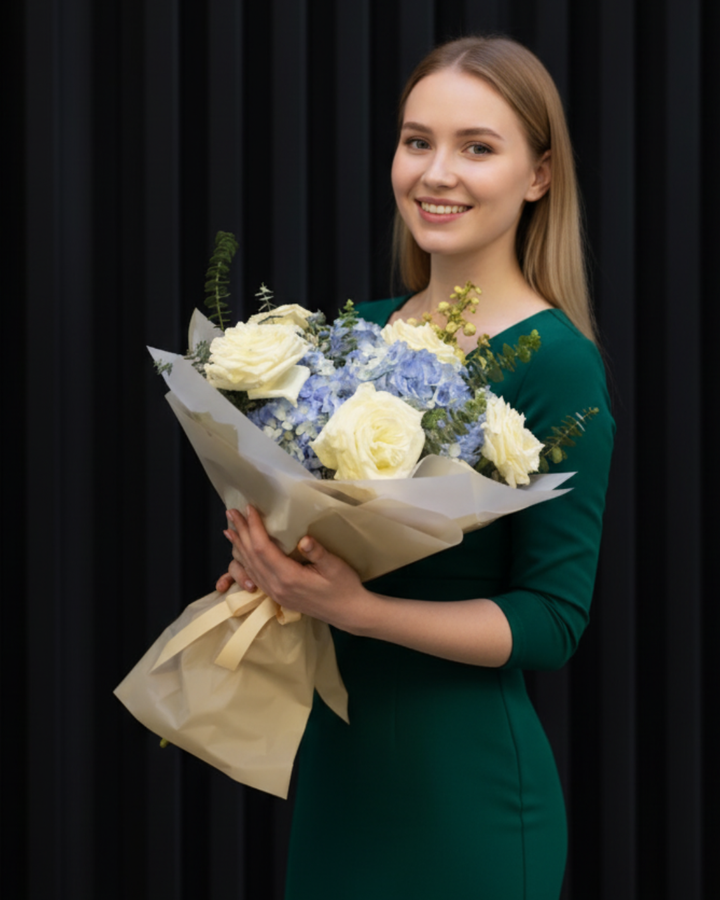 Hand-tied bouquet that captures the serene beauty of soft blues and clean whites. Crafted with blue delphinium, blue hydrangea, baby blue eucalyptus, and classic white roses, this bouquet evokes a sense of tranquility and refined grace.