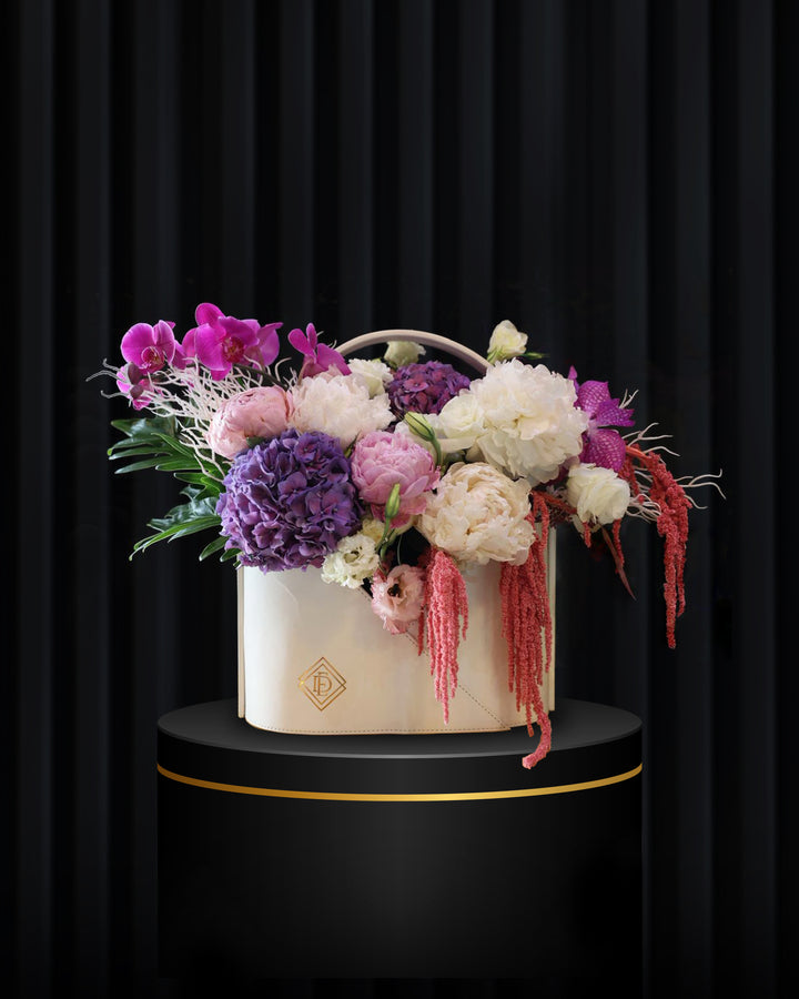 Elegant, sophisticated, and exquisitely layered, Orchid Reverie is a statement of refined luxury. Set in our white signature leather floral bag, this arrangement combines the soft romance of pink & white Peonies and Lisianthus with the striking beauty of purple Phalaenopsis orchids.