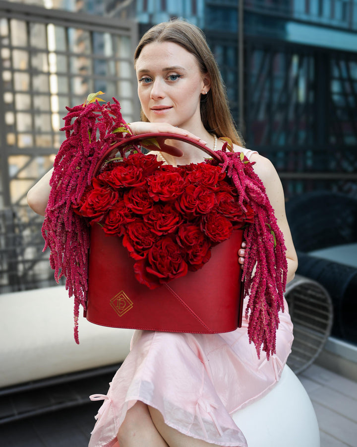 Bold, stylish, and unforgettable — our Signature Red Bag Collection is where fashion meets flowers. Featuring a luxury red leather bag filled with the world’s finest Ecuadorian red roses and finished with cascading amaranthus, this arrangement embodies timeless romance and luxury design.