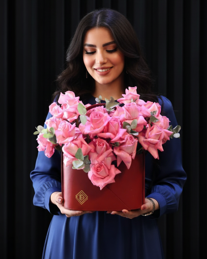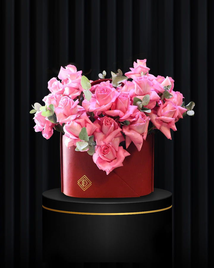 oft romance meets bold design in our Signature Red Bag with Revival Pink Roses — a modern expression of love and elegance. Handcrafted with exquisite Revival Pink Roses and accented by the silvery freshness of Eucalyptus, this arrangement strikes the perfect balance between timeless femininity and contemporary style.